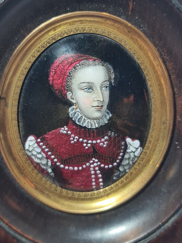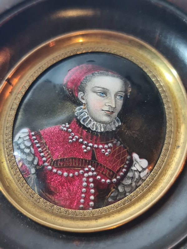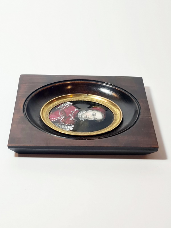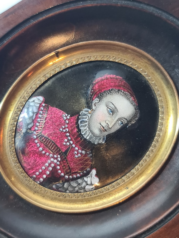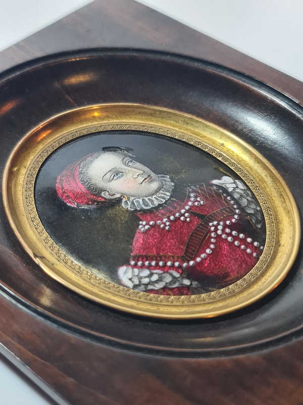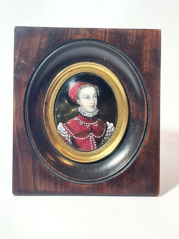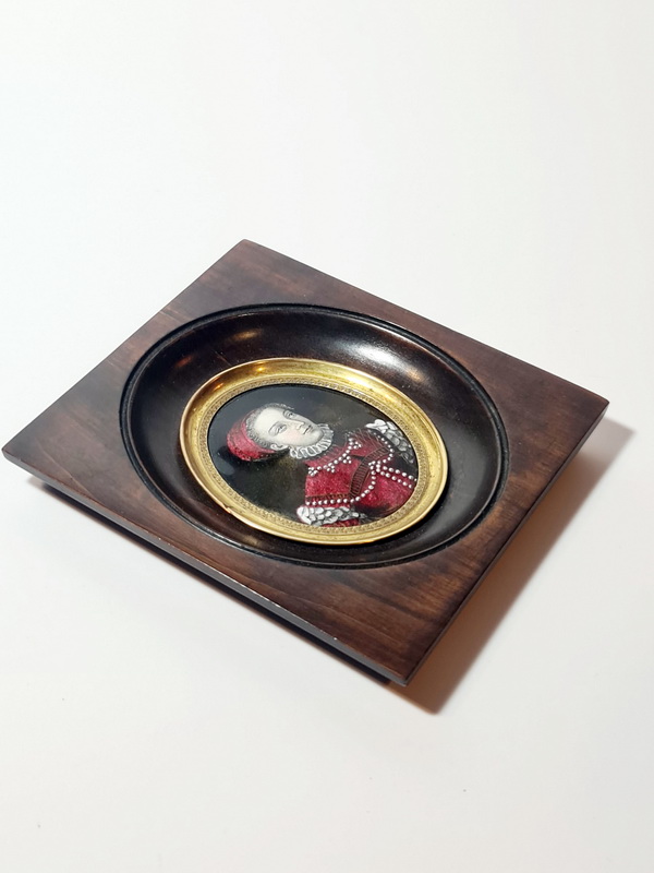 Šarmantan minijaturni portret, oslikan emajlom i datiran u polovinu 19. stoljeća, smješten u drveni okvir.